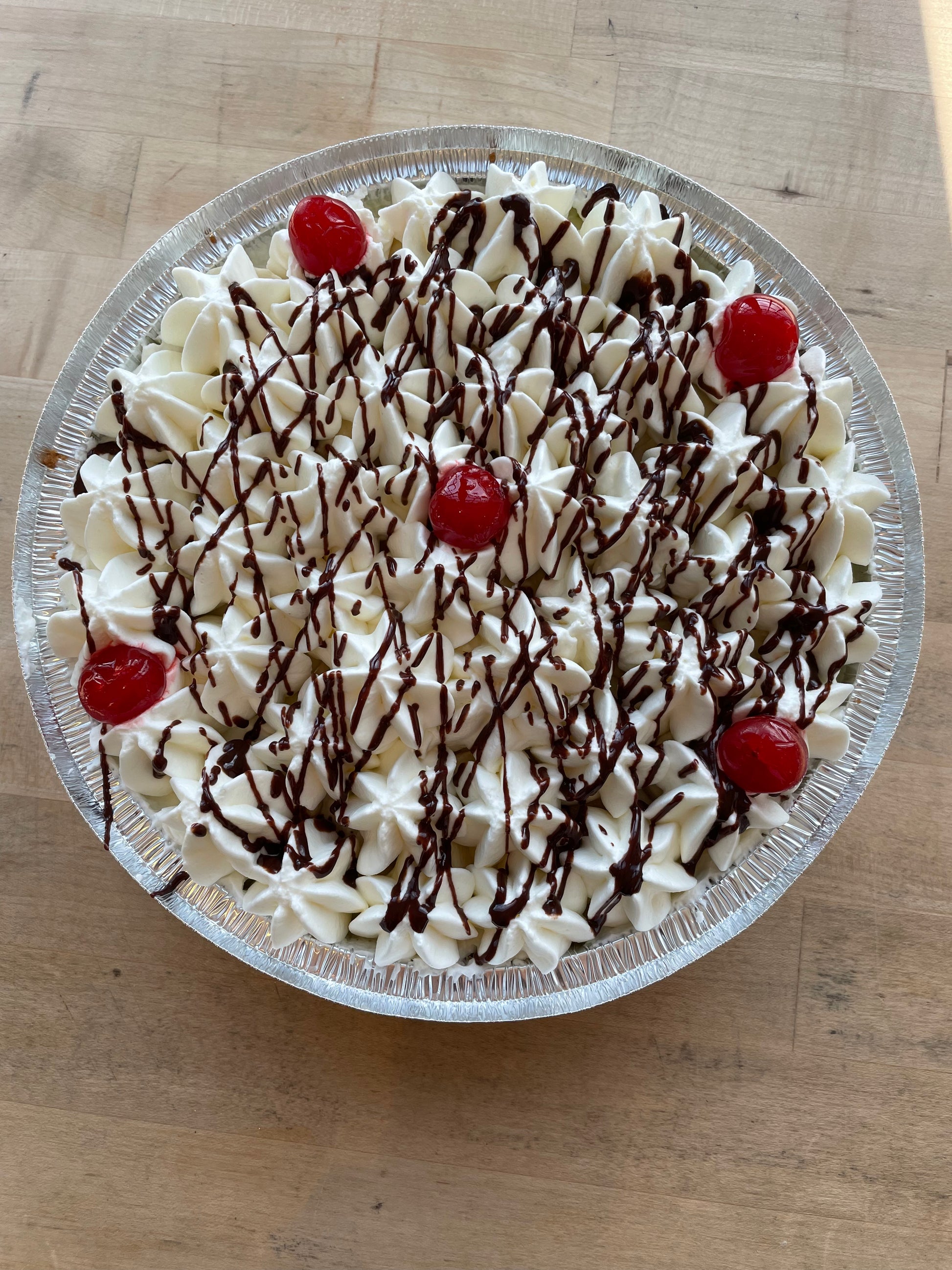 Graham Cracker Crust with a Creamy Banana Custard, topped with Whipped Cream, Chocolate Ganache and Cherries
