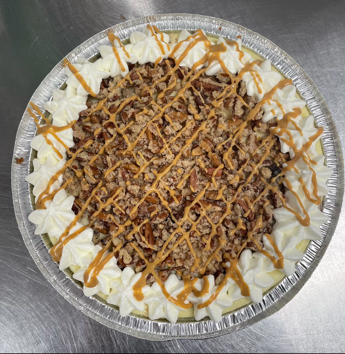 Traditional Graham Cracker Crust Brown Butter Candied Pecan Vanilla Cheesecake Base topped with even more Brown Butter Candied Pecans, Caramel Sauce and Homemade Whipped Cream