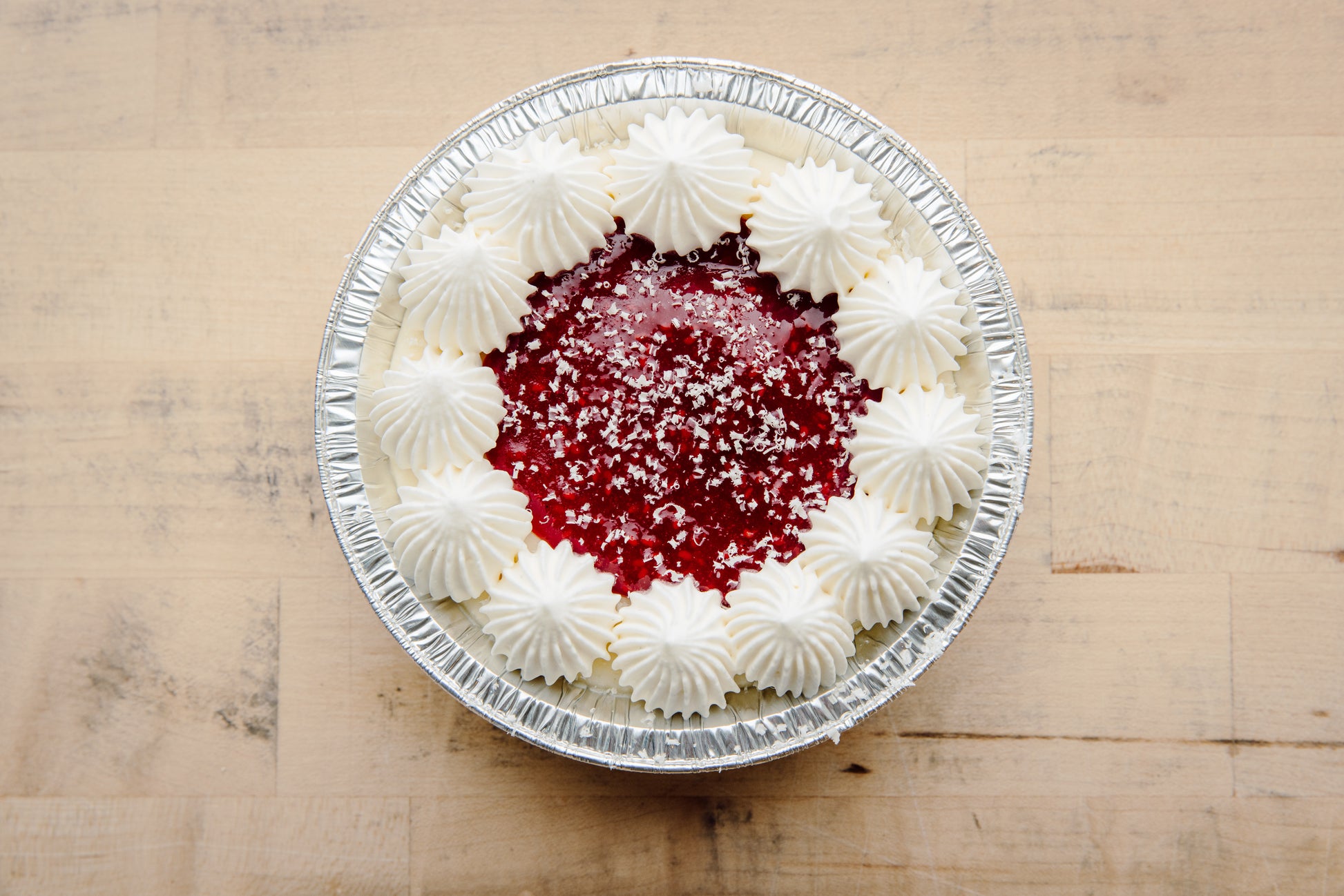Traditional Graham Cracker Crust with a White Chocolate Base, Raspberry Preserves topped with Shaved White Chocolate & Fresh Whipped Cream